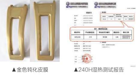 镁合金钝化是镁合金防护领域的重要组成部分;金黄色(彩虹色)纯化可以得到高导电性的防腐蚀膜层,可作为电子产品外壳的EMC防护涂层,也可以作为喷涂底层,具有非常广泛的应用;黑色钝化作为光学器件的消光性功能性要求,其纯黑色的外观也具有无可替代的地位。灰色无铬钝化膜是重要的喷涂底层,可以大幅提高喷涂附着力,减少涂层起泡和丝状腐蚀。