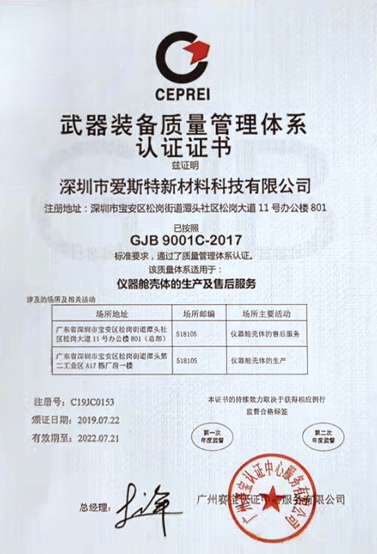 2019年6月通过GJB9001C-2017军工产品质量保证体系的认证。截止目前,爱斯特新材料已于中电科技集团二十九所、中航空空导弹研究院、中国空间技术研究院等军工单位达成战略合作,共同承担军工行业“十四五”规划相关项目的轻量化材料研制生产。